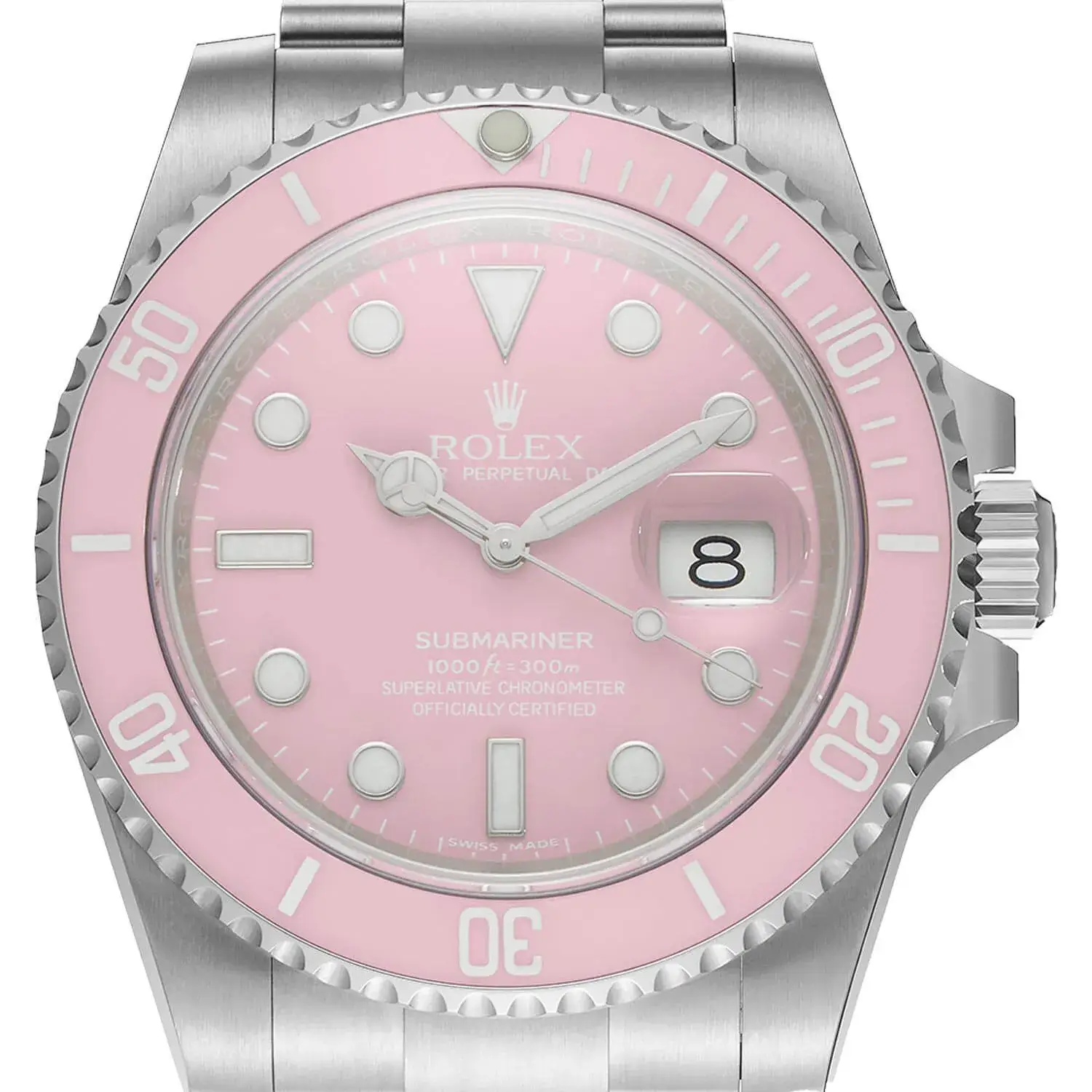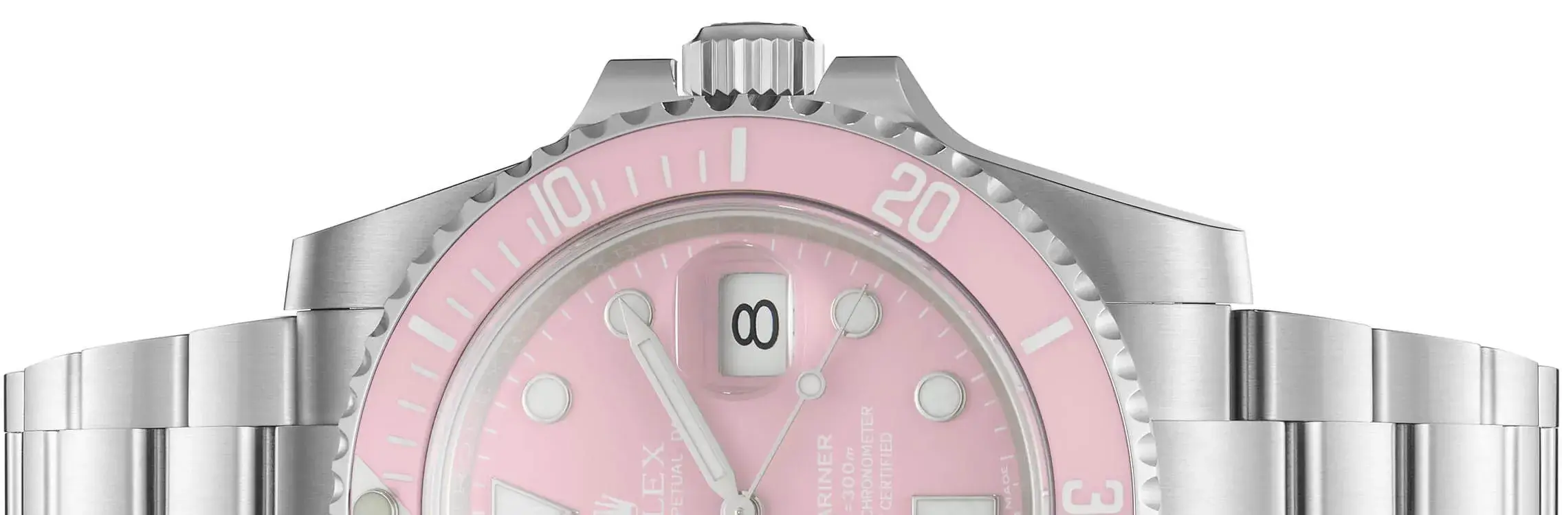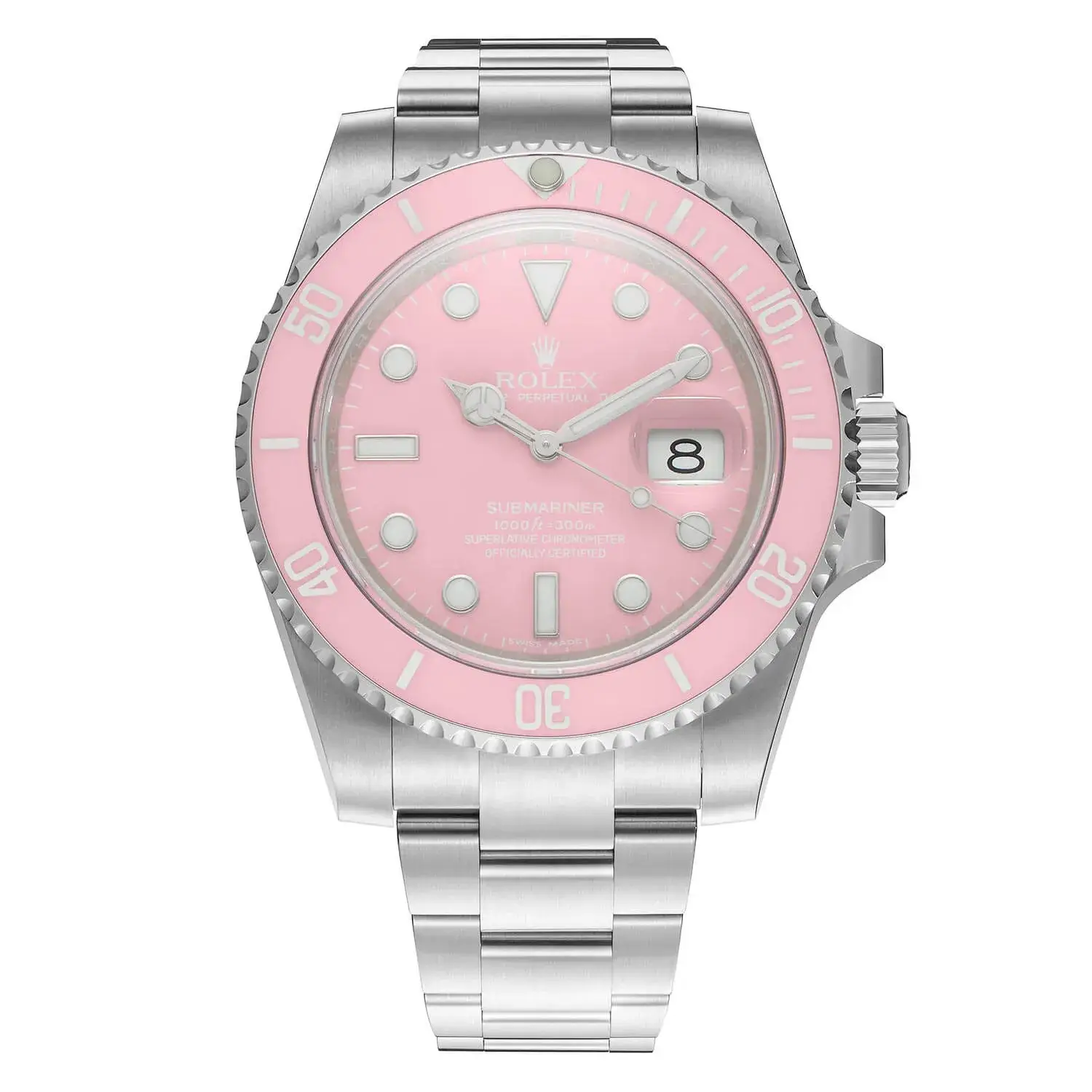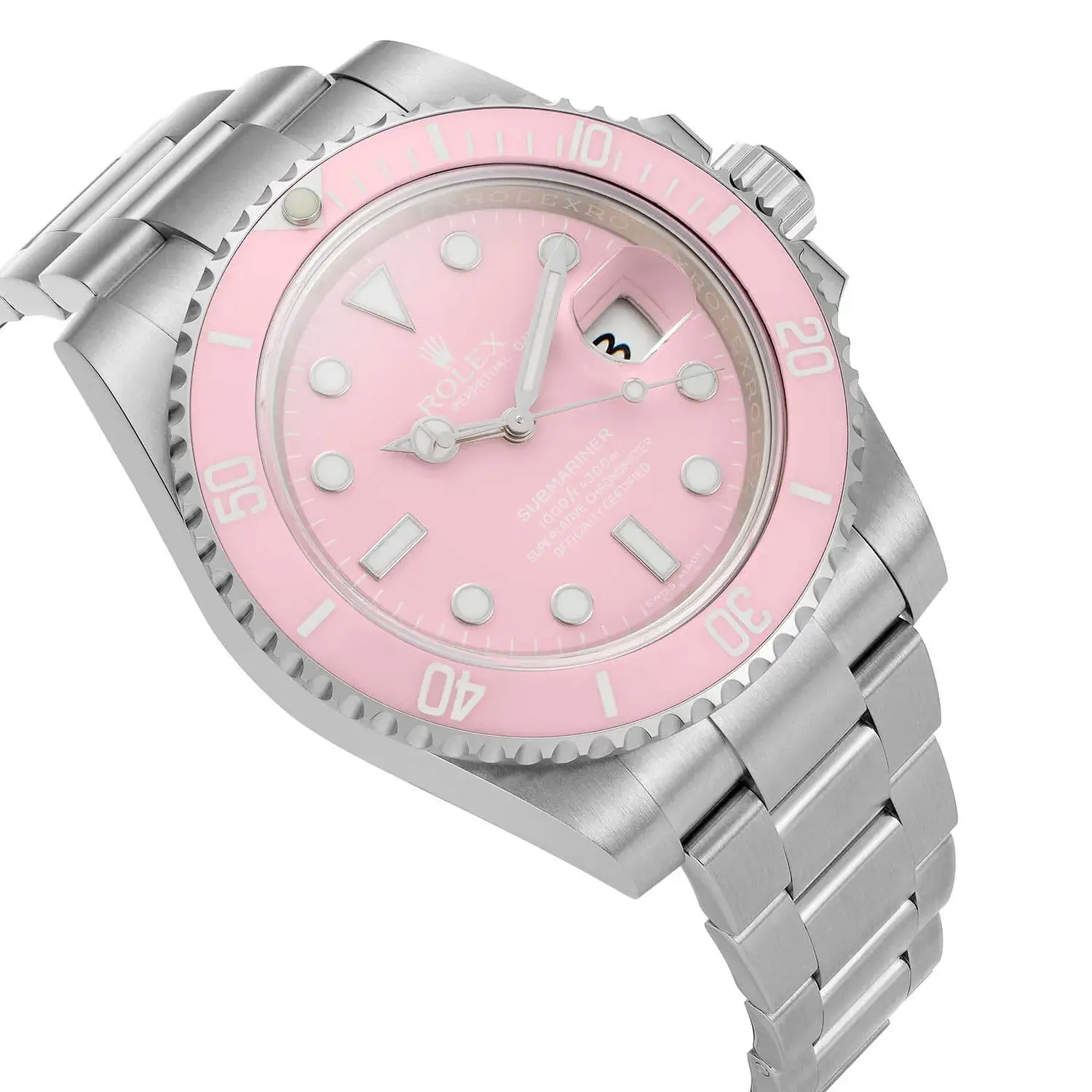 Ein maßgeschneiderter Einsatz aus rosafarbener Keramik auf der Lünette und ein individuelles Zifferblatt im gleichen Farbton verleihen diesem Klassiker ein jugendliches und feminines Upgrade, das mit Sicherheit alle Blicke auf sich zieht.
