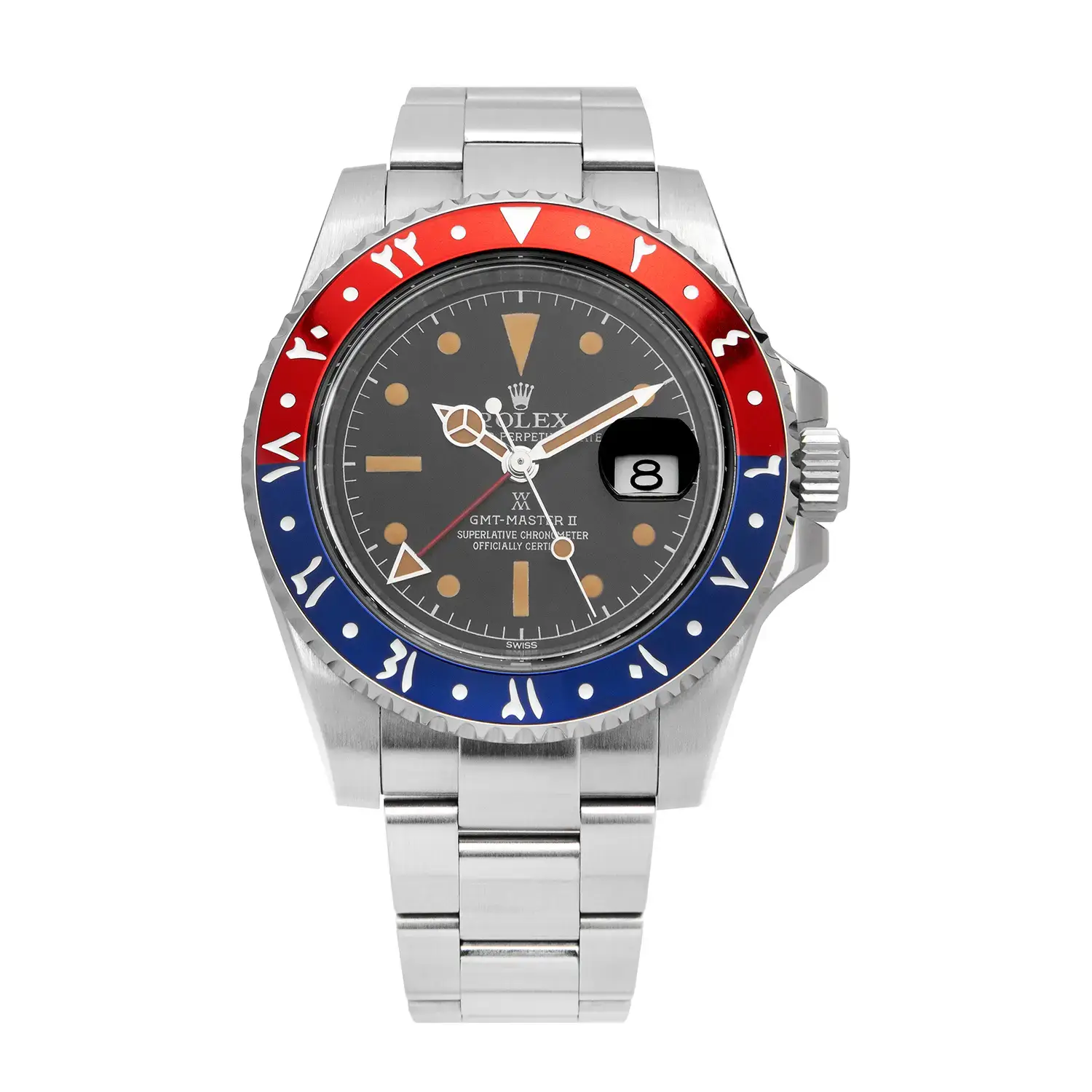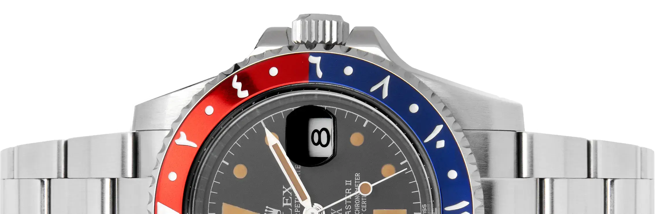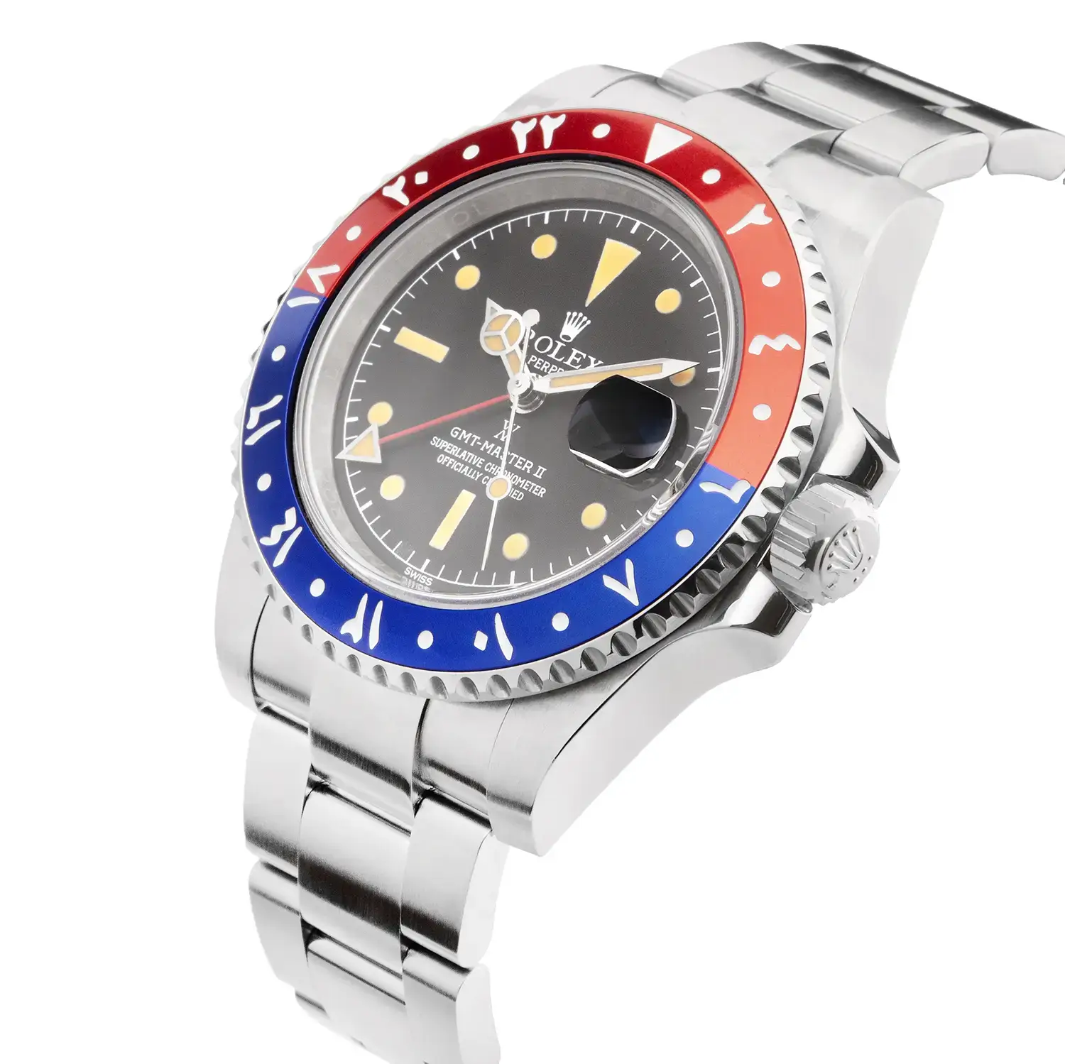Inspiriert von einer Rolex-Rarität, verfügt diese arabische GMT-Master II über ein Vintage-inspiriertes Zifferblatt und eine einzigartige arabische Lünette mit umgekehrter Pepsi-Anzeige.