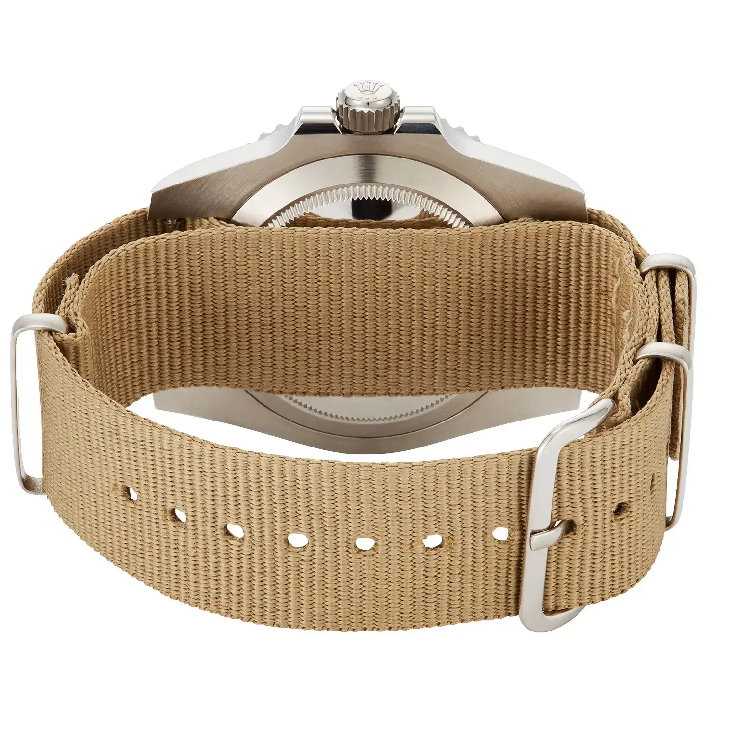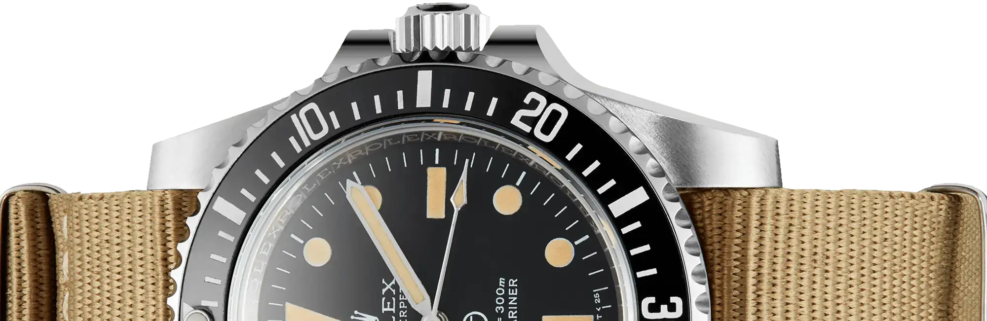 Wir haben das moderne Gehäuse der Submariner 114060 genommen und die Bandanstöße überarbeitet, um die gleiche gleichmäßige, schräge Maserung zu erhalten, die für jede alte Sub typisch ist. Die Uhr wird mit drei separaten NATO-Armbändern aus Segeltuch geliefert, die alle das Design ergänzen und zur Langlebigkeit der Uhr beitragen.