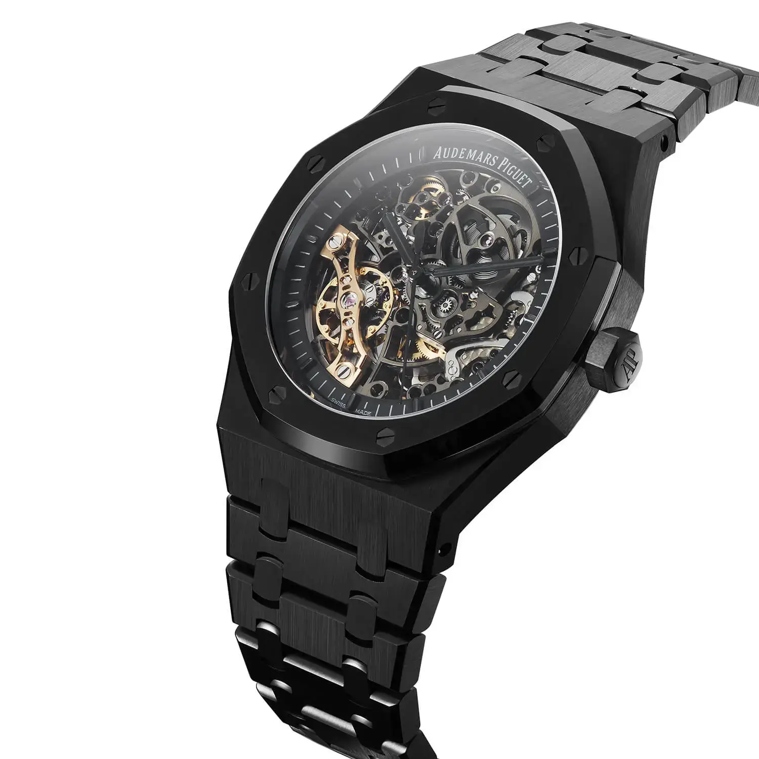Das durchbrochene Zifferblatt und die Zeiger wurden wurden von Hand mit einem atemberaubenden schwarz-dunkelgrauen Farbschema versehen, das die schlichte schwarze Ästhetik der Uhr Ästhetik.