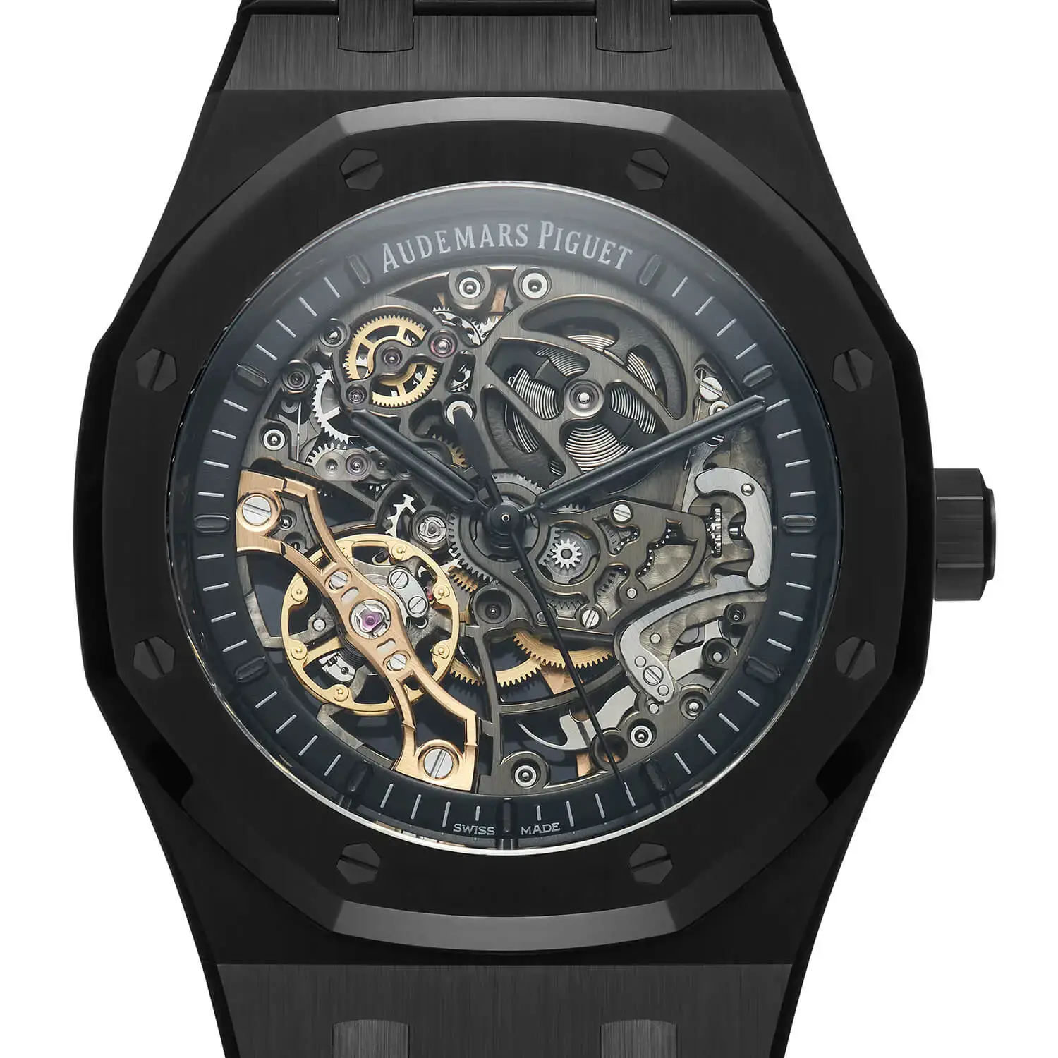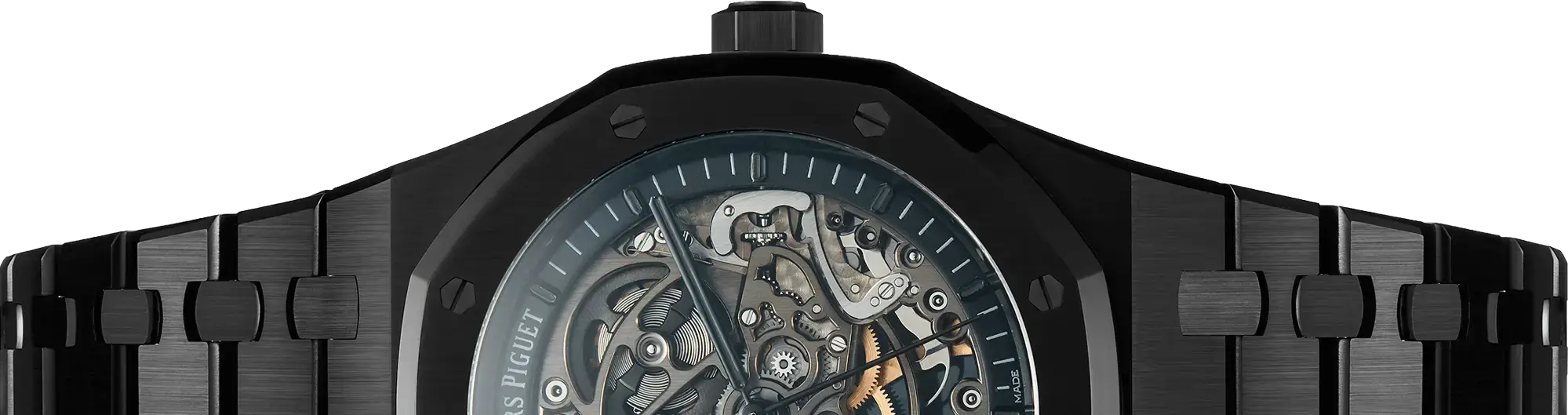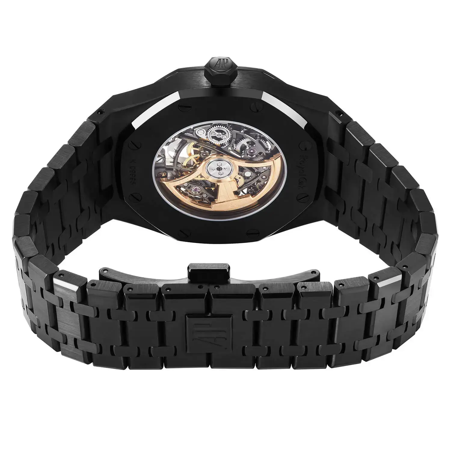 Unsere schwarze DLC-Beschichtung verleiht dem Armband und dem Gehäuse der Royal Oak einen unauffälligen Look. und Gehäuse der Royal Oak, was ihr scharfes und kantiges Design unterstreicht und das individuell gestaltete Zifferblatt ergänzt.